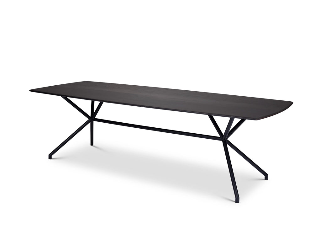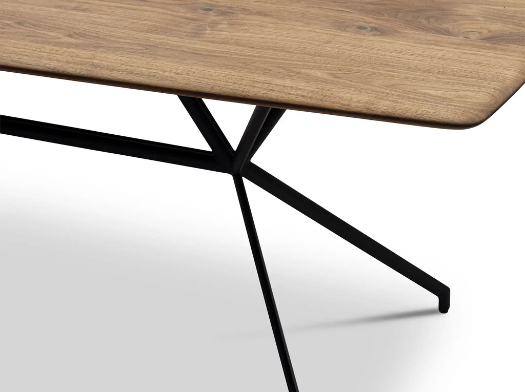 Der industrielle Charme des Möbelstücks TARAS von Christine Kröncke lädt zu unvergesslichen Momenten ein - an Ihrem eigenen Esstisch. Das Design dieses Esstisches lässt genug Platz für jegliche Speisen und Gerichte. Die hochwertige Massivholzplatte ist in einer Bootsform gestaltet und erscheint in geöltem, längsmassivem Nussbaum. Die Platte wird von einem pulverbeschichteten, schwarzen Edelstahlgestell getragen. Das Gestell bildet einen modernen Kontrast zum warmen Holzton der Tischplatte.